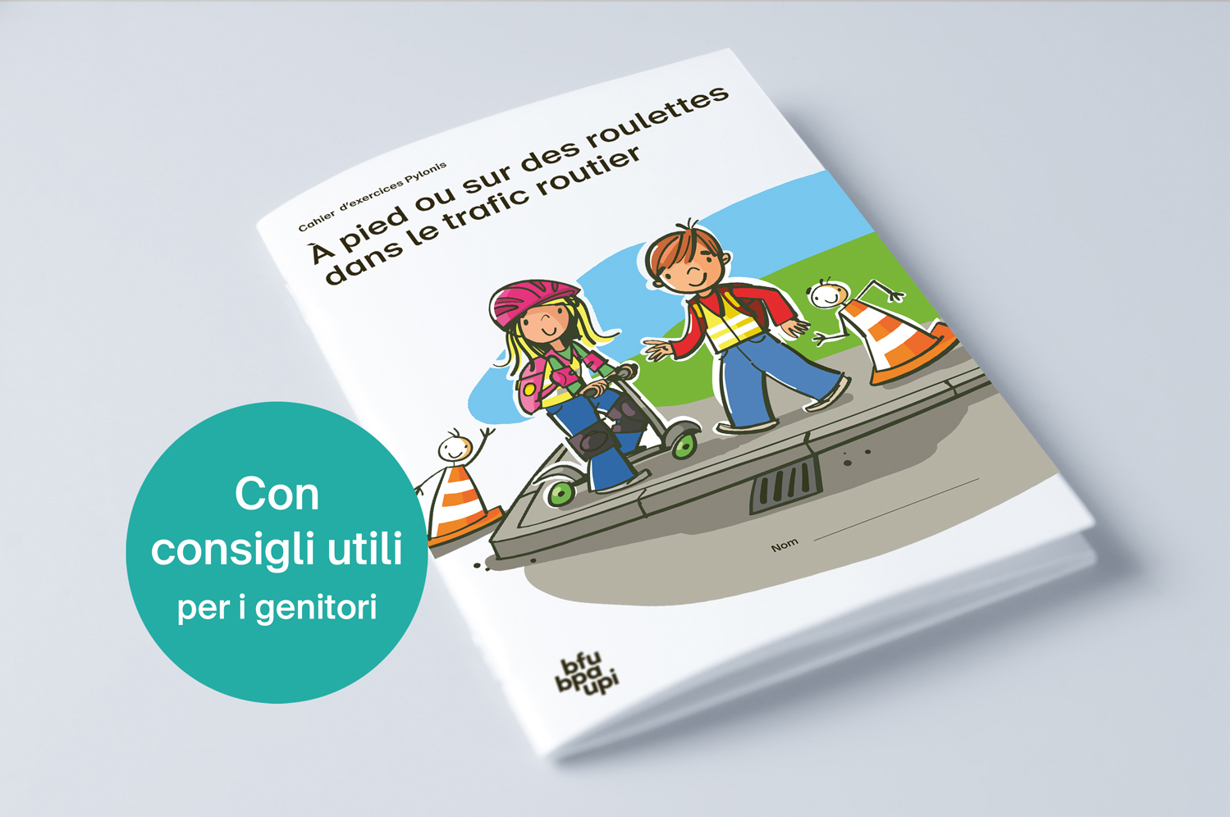 Lettera-Pylonis per genitori 1 «Occhio al passaggio pedonale». Busta con informazione ai genitori, poster Pylonis che include i foglietti d’estrazione per i bambini. I docenti consegnano ai bambini gli adesivi-premio da portare a casa (dopo che hanno superato i «mini-esami»). 1 copia per classe / per bambini da 4 a 6 anni.