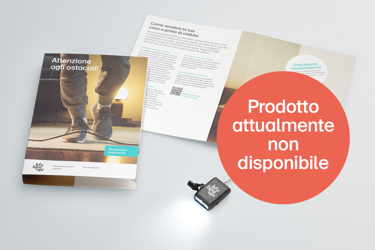 Una piccola disattenzione, una breve distrazione ed ecco che un inciampo si trasforma in una caduta. Si cade ad es. perché si inciampa in un cavo, perché il pavimento è scivoloso o perché le scale non sono illuminate bene. Con il SafetyKit dell’UPI le aziende possono garantire al proprio personale una casa a prova di caduta.